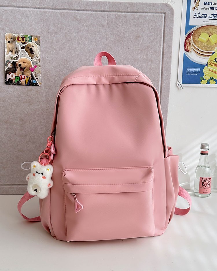 Upgraded pink Oxford cloth backpack with jingle bear and letter details. Zipper closure with computer slip pocket inside. Medium-soft hardness, three-dimensional design for school and daily use.
